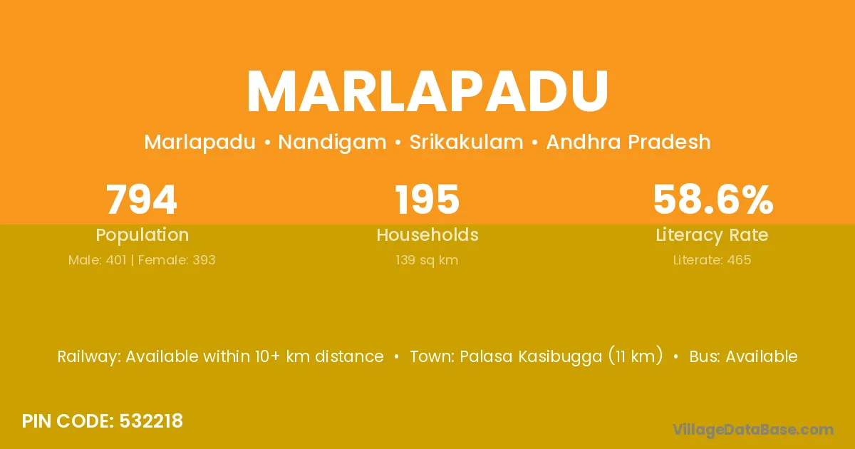 Marlapadu village has a total population of 794 people, of which 401 are males and 393 are females.