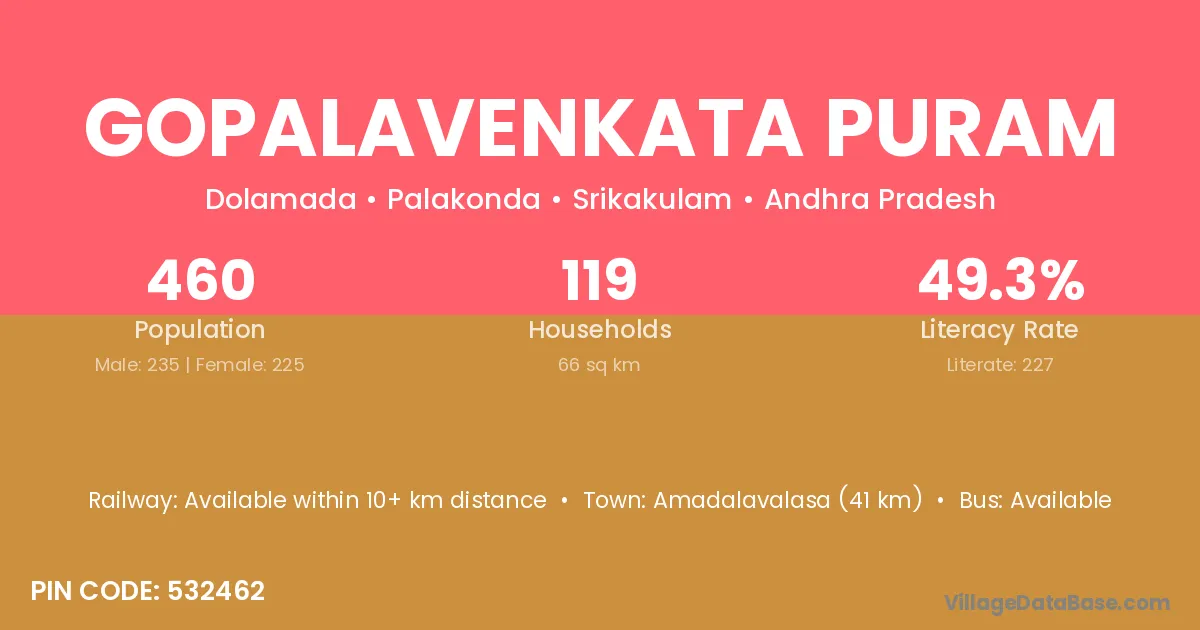 Amadalavalasa (41 km) is the nearest town to Gopalavenkata Puram village for major economic activities and is located approximately 41 km away.