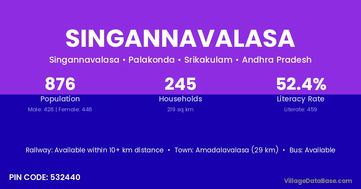 Singannavalasa village has a total population of 876 people, of which 428 are males and 448 are females.