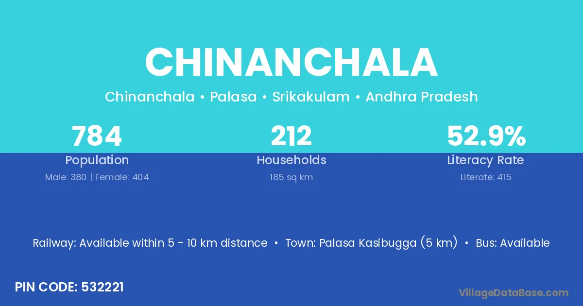 Palasa Kasibugga (5 km) is the nearest town to Chinanchala village for major economic activities and is located approximately 5 km away.