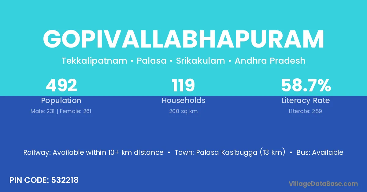 Palasa Kasibugga (13 km) is the nearest town to Gopivallabhapuram village for major economic activities and is located approximately 13 km away.