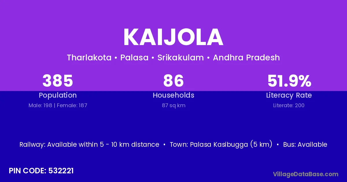 Palasa Kasibugga (5 km) is the nearest town to Kaijola village for major economic activities and is located approximately 5 km away.