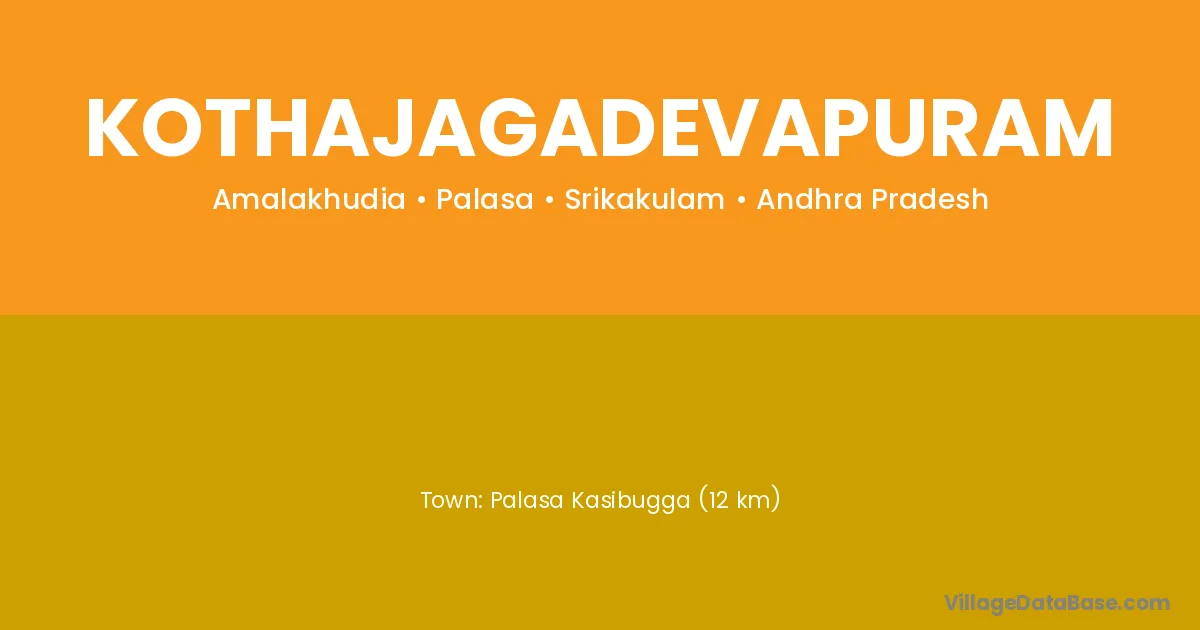 Palasa Kasibugga (12 km) is the nearest town to Kothajagadevapuram village for major economic activities and is located approximately 12 km away.