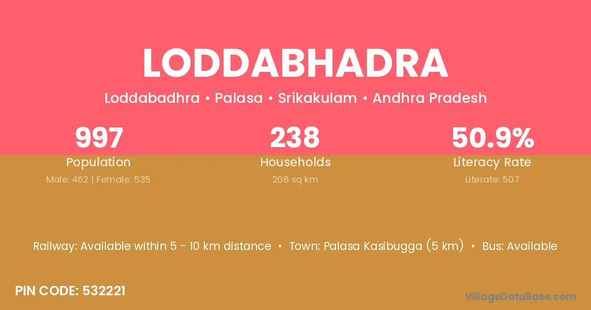 Palasa Kasibugga (5 km) is the nearest town to Loddabhadra village for major economic activities and is located approximately 5 km away.
