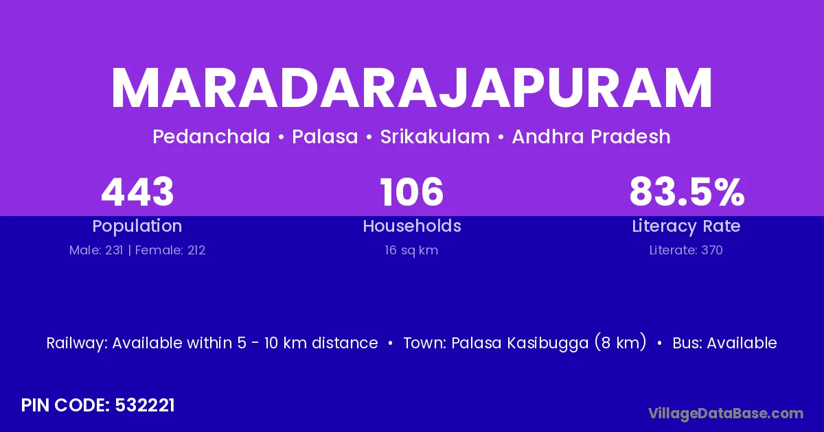 Palasa Kasibugga (8 km) is the nearest town to Maradarajapuram village for major economic activities and is located approximately 8 km away.