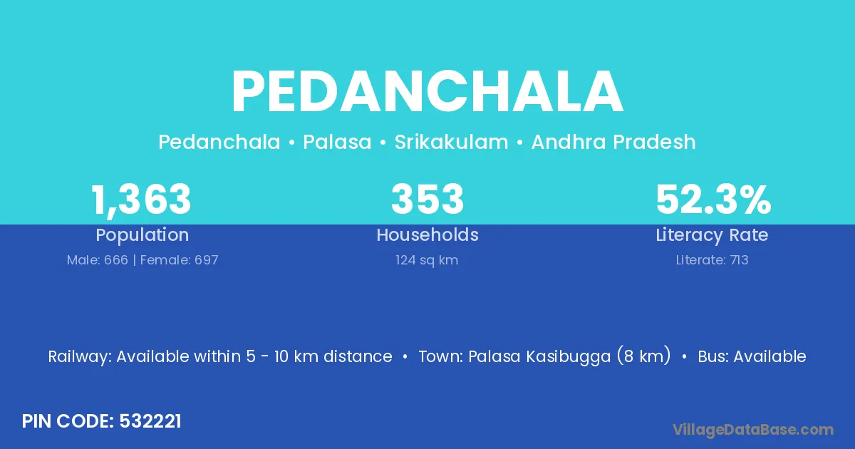 Palasa Kasibugga (8 km) is the nearest town to Pedanchala village for major economic activities and is located approximately 8 km away.