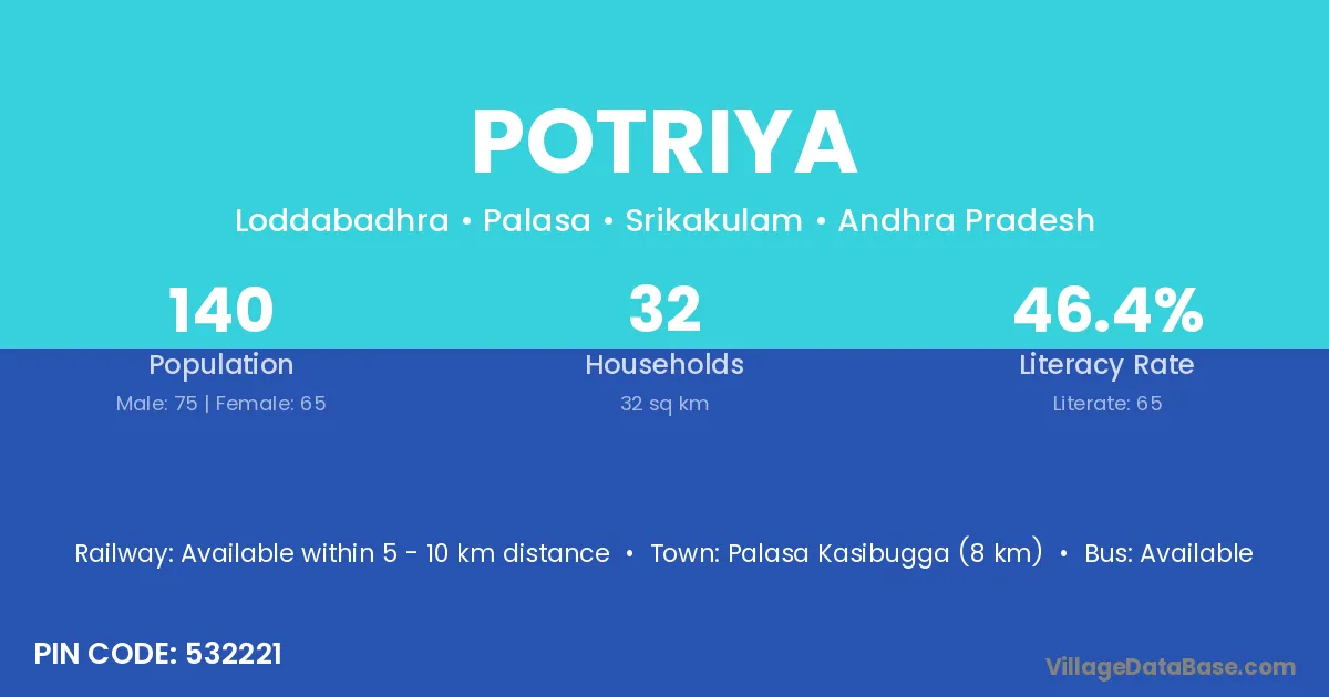 Palasa Kasibugga (8 km) is the nearest town to Potriya village for major economic activities and is located approximately 8 km away.