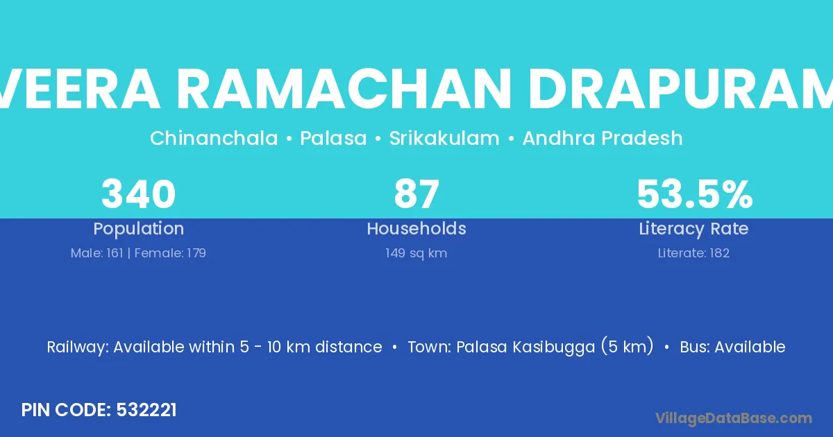 Palasa Kasibugga (5 km) is the nearest town to Veera Ramachan Drapuram village for major economic activities and is located approximately 5 km away.