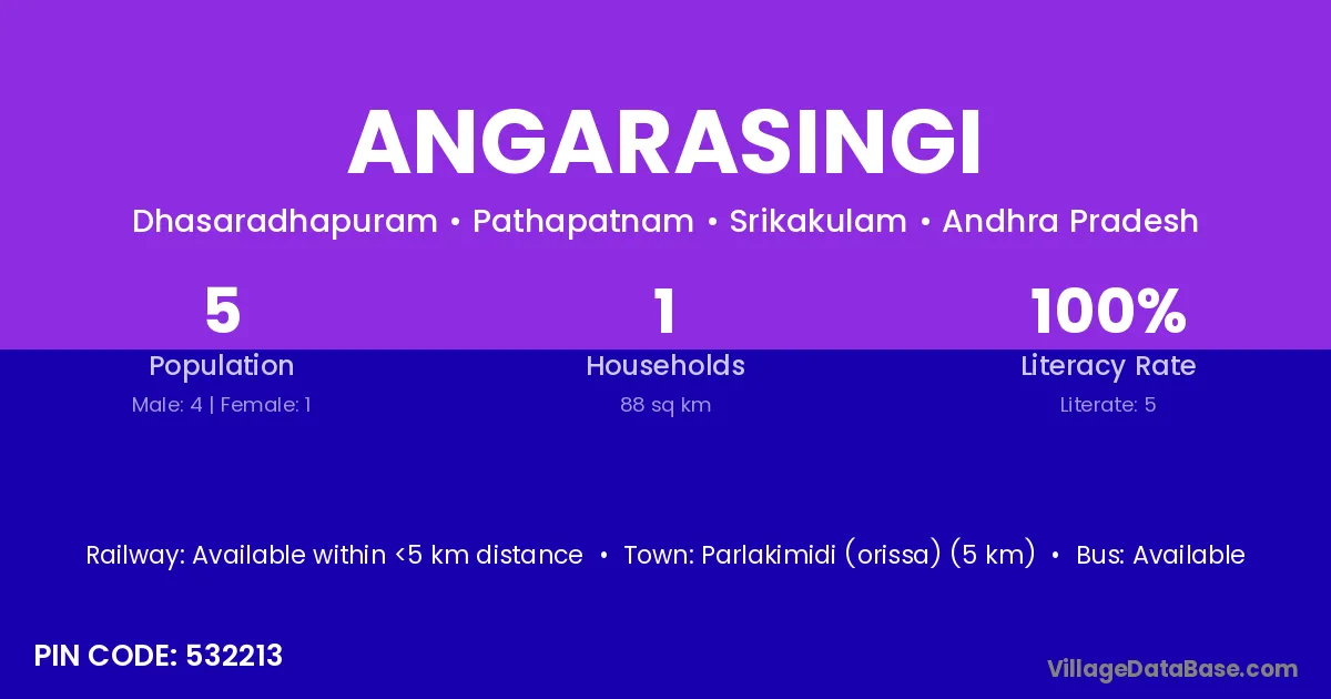Parlakimidi (orissa) (5 km) is the nearest town to Angarasingi village for major economic activities and is located approximately 5 km away.