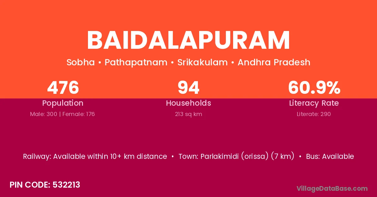 Baidalapuram village has a total population of 476 people, of which 300 are males and 176 are females.