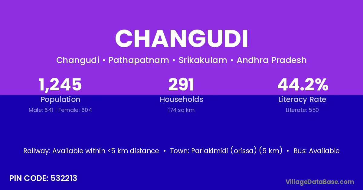Parlakimidi (orissa) (5 km) is the nearest town to Changudi village for major economic activities and is located approximately 5 km away.
