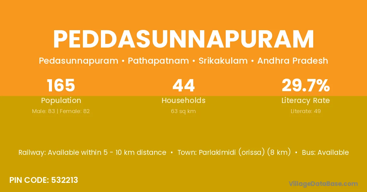 Peddasunnapuram village has a total population of 165 people, of which 83 are males and 82 are females.