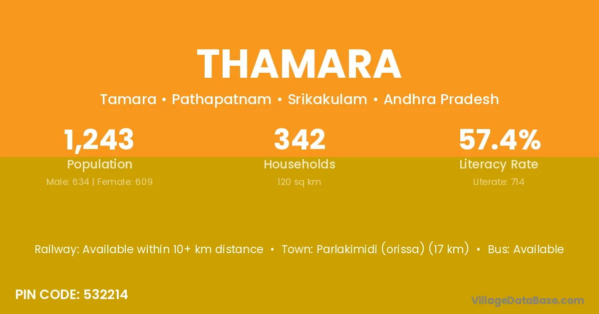 Parlakimidi (orissa) (17 km) is the nearest town to Thamara village for major economic activities and is located approximately 17 km away.