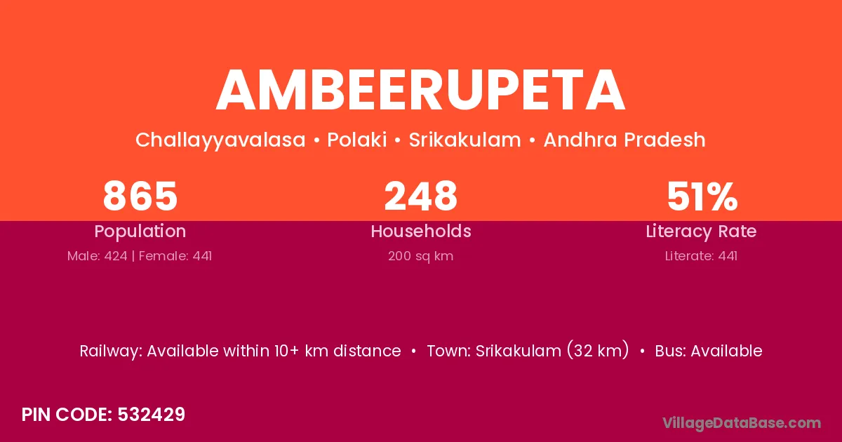 Ambeerupeta village has a total population of 865 people, of which 424 are males and 441 are females.