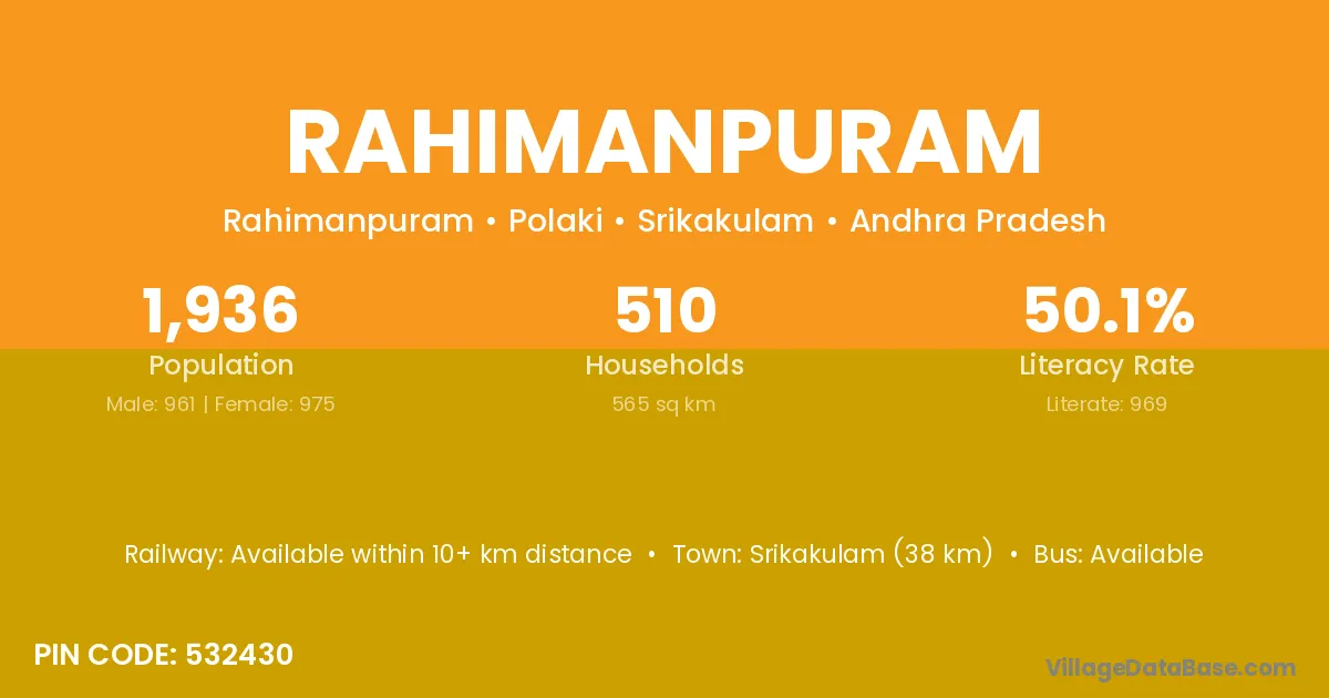 Rahimanpuram village has a total population of 1,936 people, of which 961 are males and 975 are females.