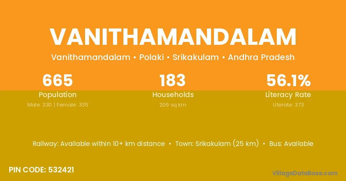 Srikakulam (25 km) is the nearest town to Vanithamandalam village for major economic activities and is located approximately 25 km away.