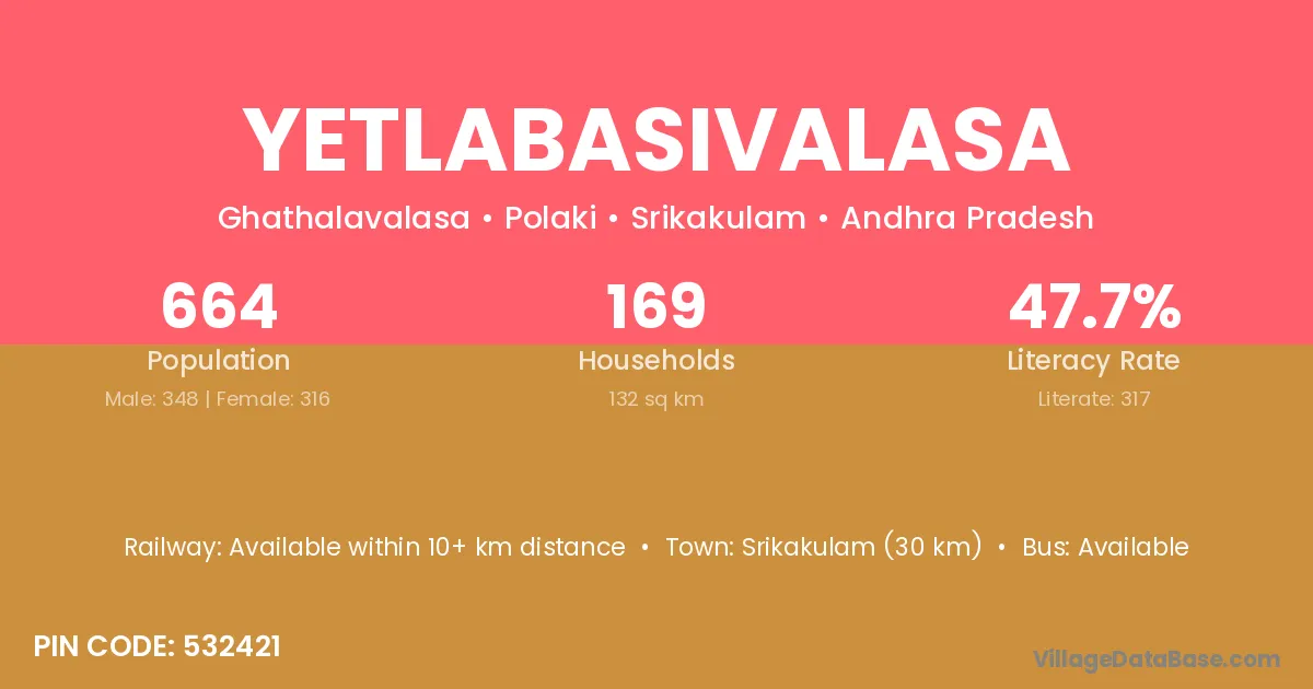 Yetlabasivalasa village has a total population of 664 people, of which 348 are males and 316 are females.