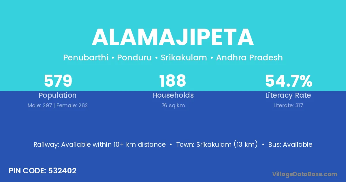 Srikakulam (13 km) is the nearest town to Alamajipeta village for major economic activities and is located approximately 13 km away.