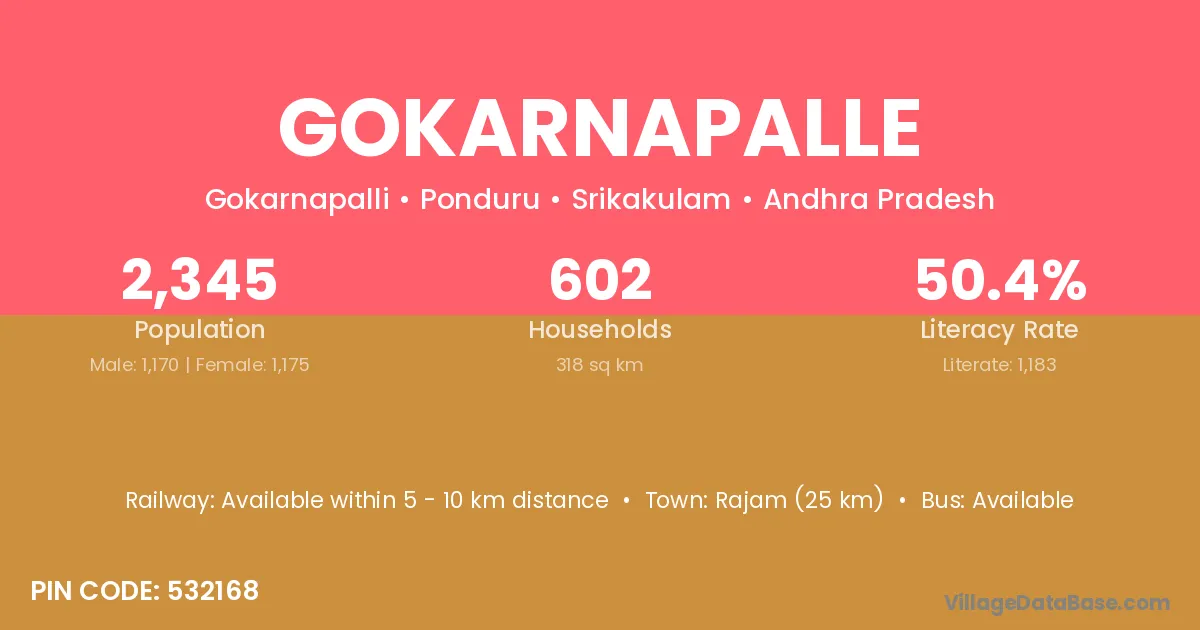 Gokarnapalle village has a total population of 2,345 people, of which 1,170 are males and 1,175 are females.