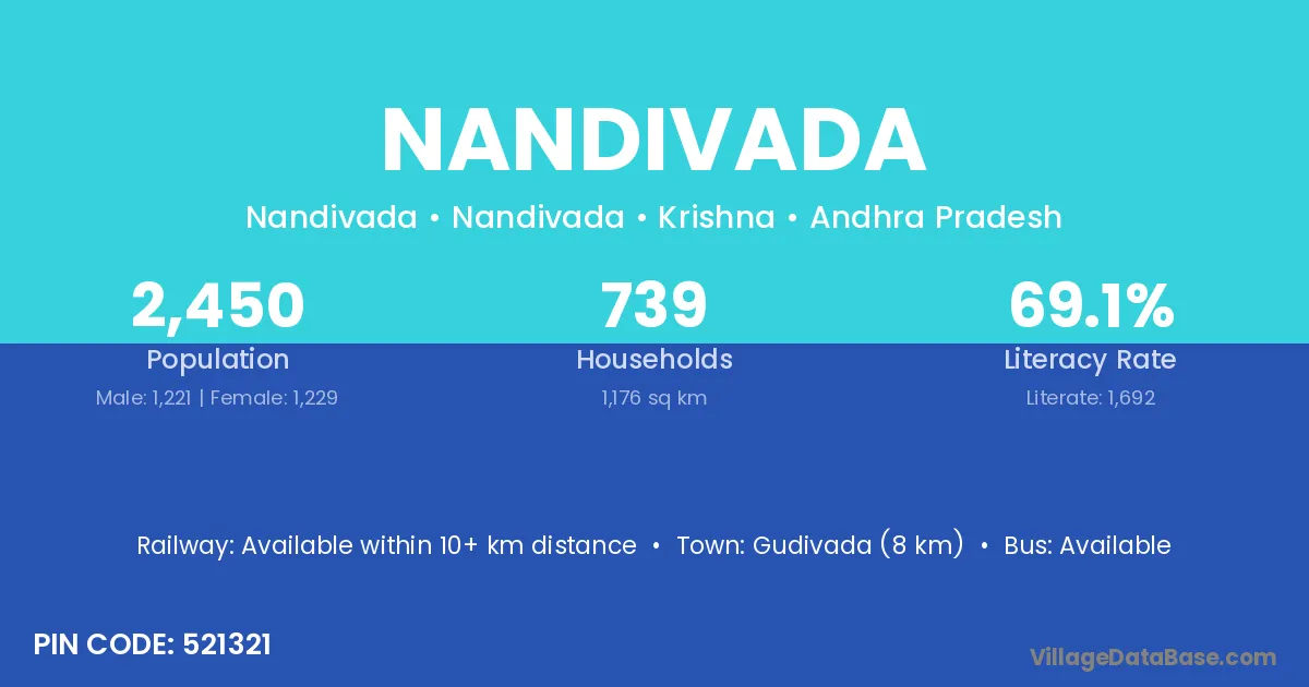 Srikakulam (17 km) is the nearest town to Nandivada village for major economic activities and is located approximately 17 km away.