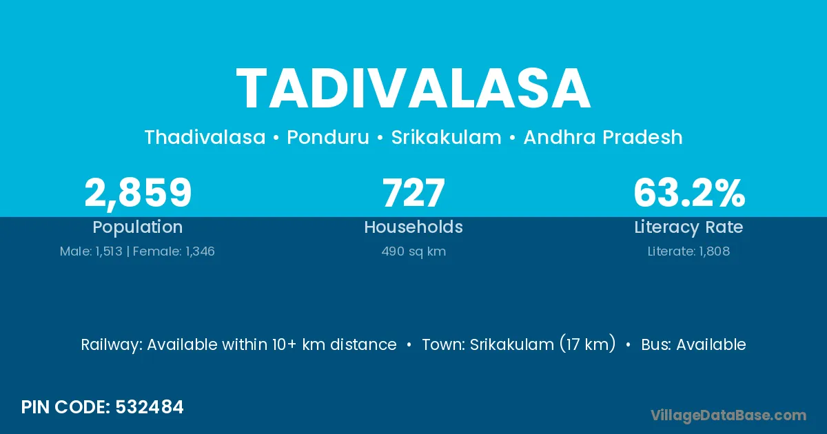 Tadivalasa village has a total population of 2,859 people, of which 1,513 are males and 1,346 are females.