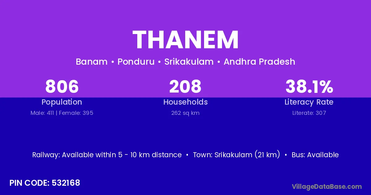 Srikakulam (21 km) is the nearest town to Thanem village for major economic activities and is located approximately 21 km away.