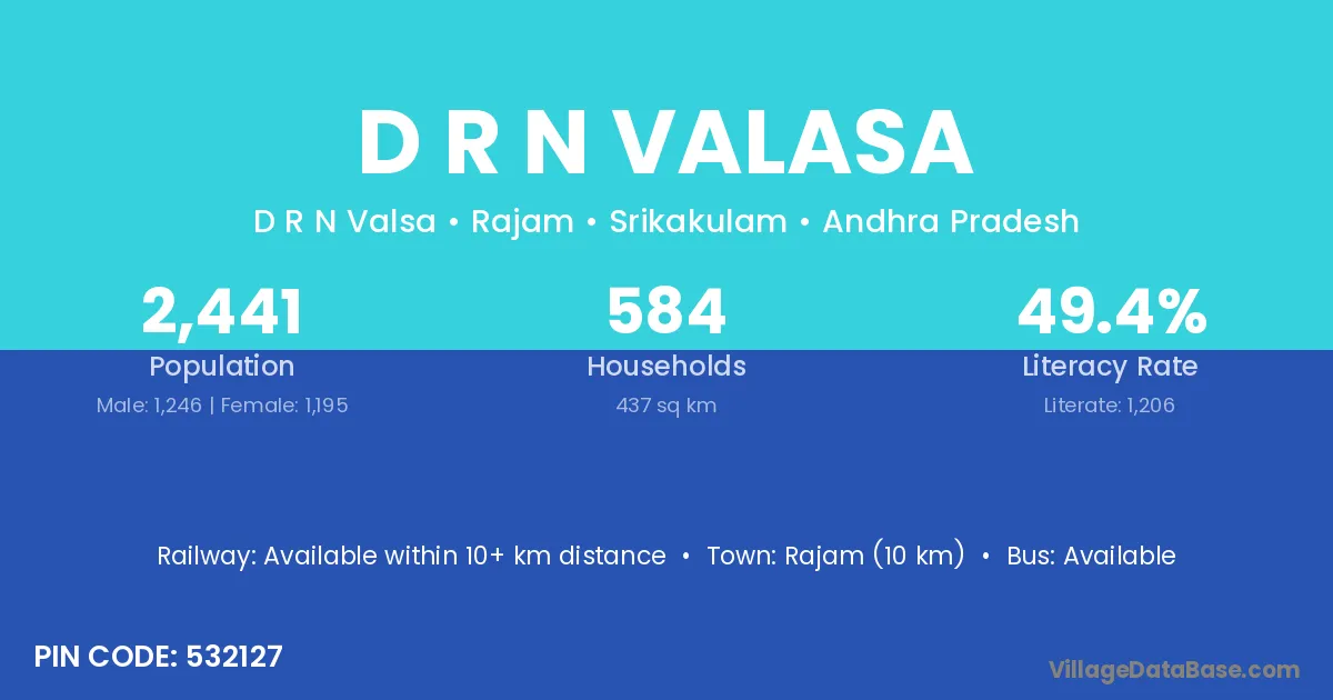 D R N Valasa village has a total population of 2,441 people, of which 1,246 are males and 1,195 are females.