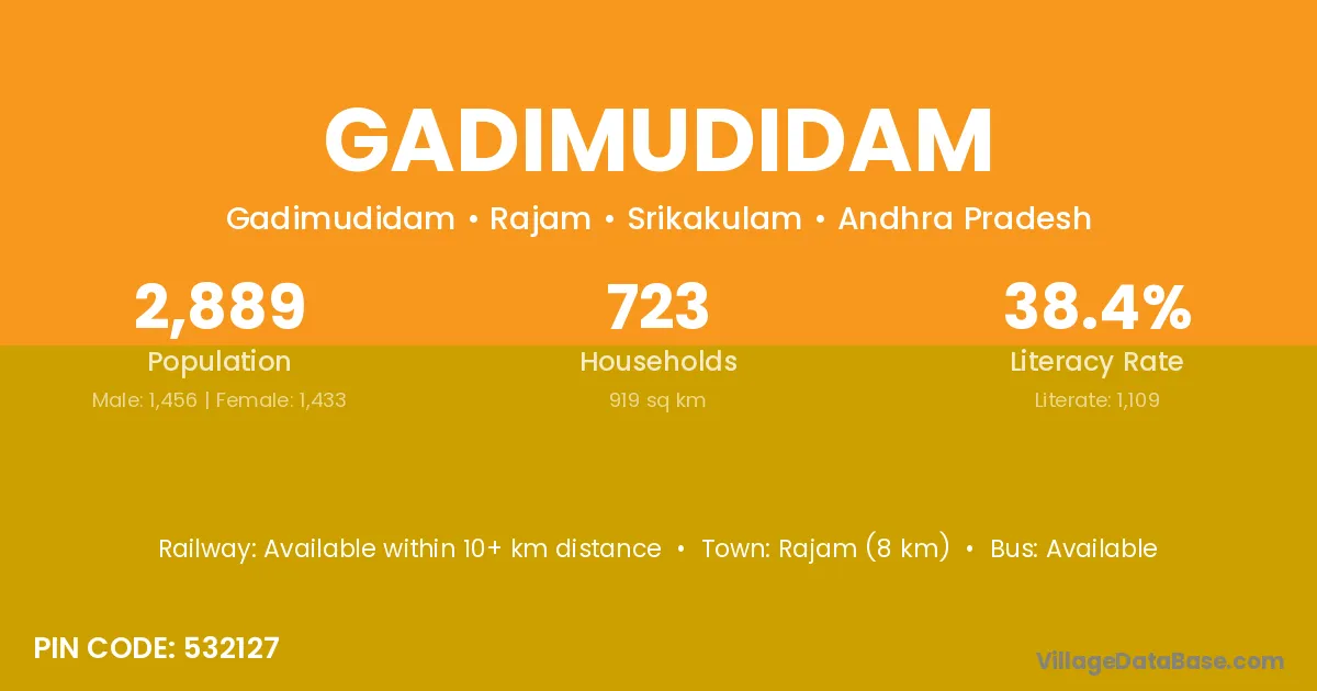 Gadimudidam village has a total population of 2,889 people, of which 1,456 are males and 1,433 are females.