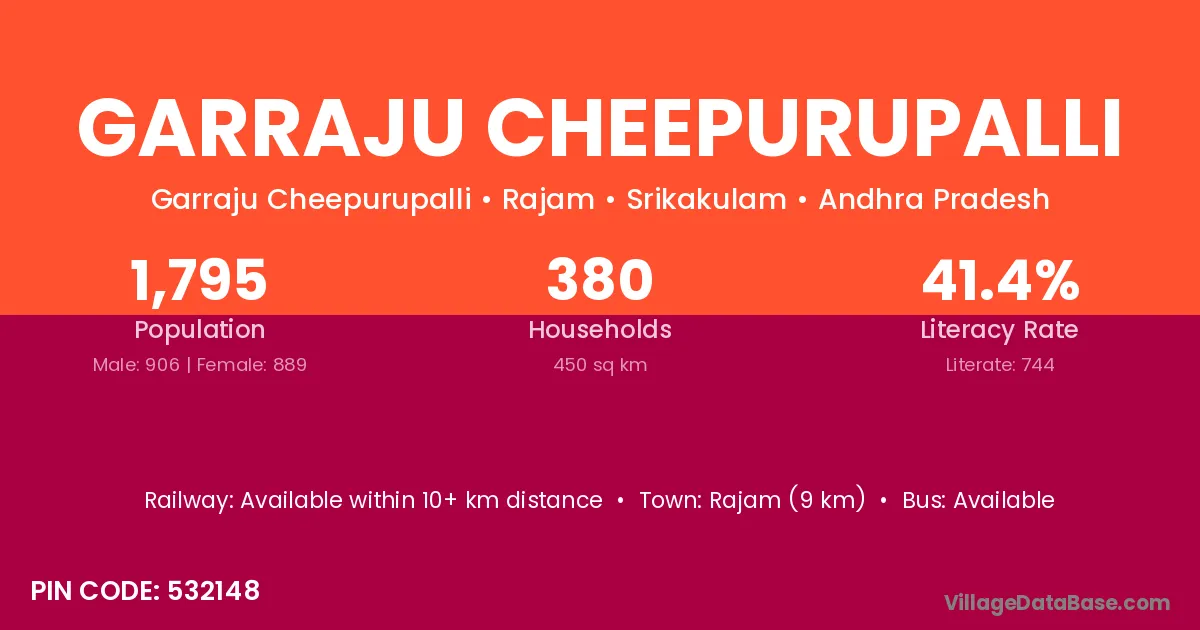 Rajam (9 km) is the nearest town to Garraju Cheepurupalli village for major economic activities and is located approximately 9 km away.