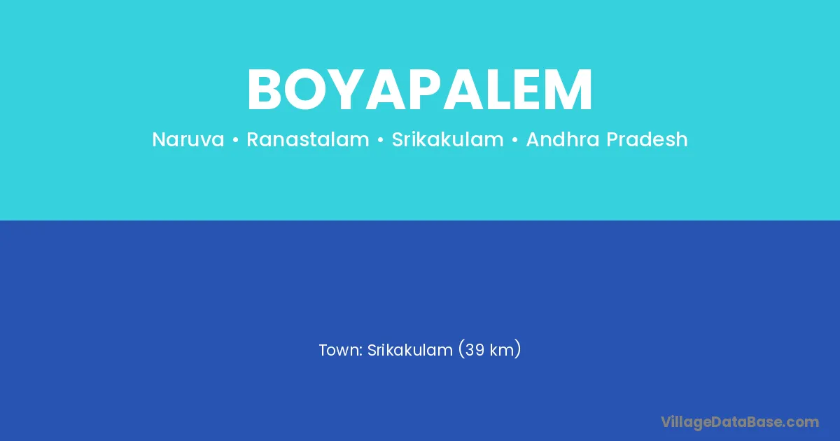 Srikakulam (39 km) is the nearest town to Boyapalem village for major economic activities and is located approximately 39 km away.