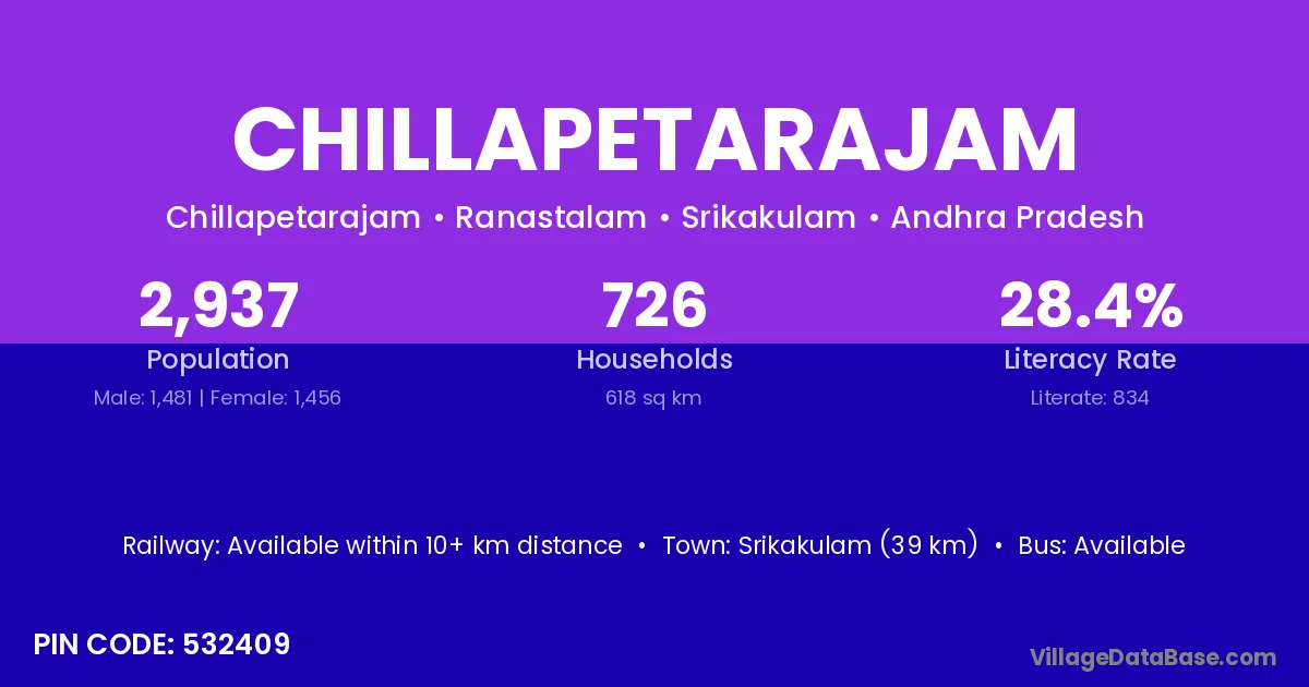 Srikakulam (39 km) is the nearest town to Chillapetarajam village for major economic activities and is located approximately 39 km away.