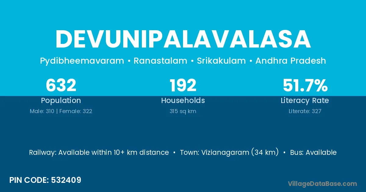 Devunipalavalasa village has a total population of 632 people, of which 310 are males and 322 are females.