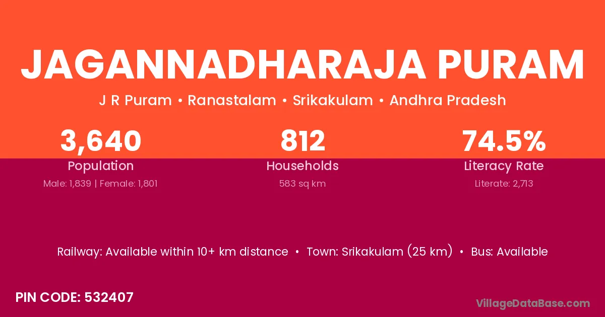 Jagannadharaja Puram village has a total population of 3,640 people, of which 1,839 are males and 1,801 are females.
