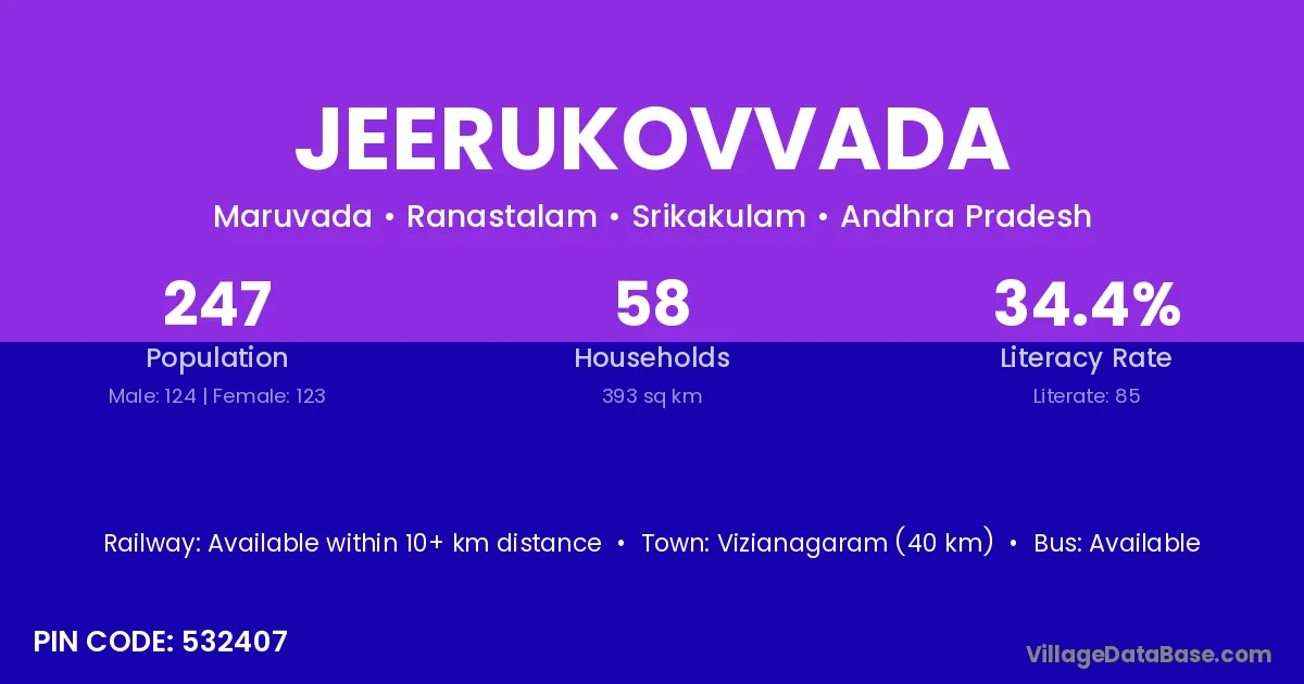 Jeerukovvada village has a total population of 247 people, of which 124 are males and 123 are females.