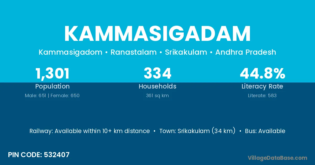 Srikakulam (34 km) is the nearest town to Kammasigadam village for major economic activities and is located approximately 34 km away.