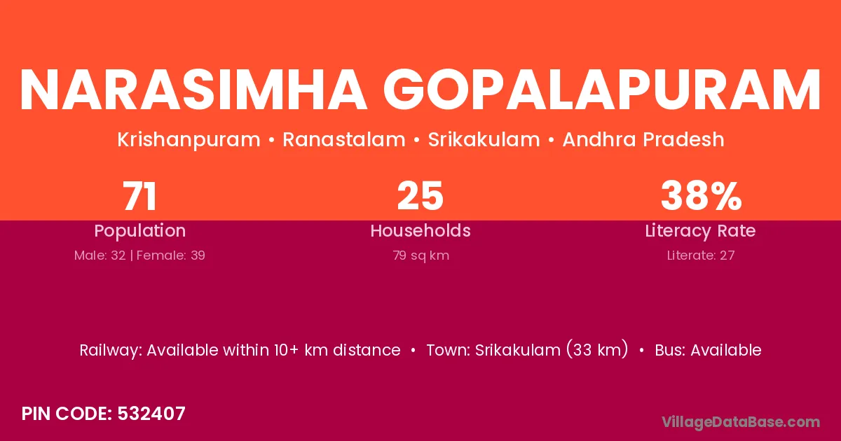 Srikakulam (33 km) is the nearest town to Narasimha Gopalapuram village for major economic activities and is located approximately 33 km away.