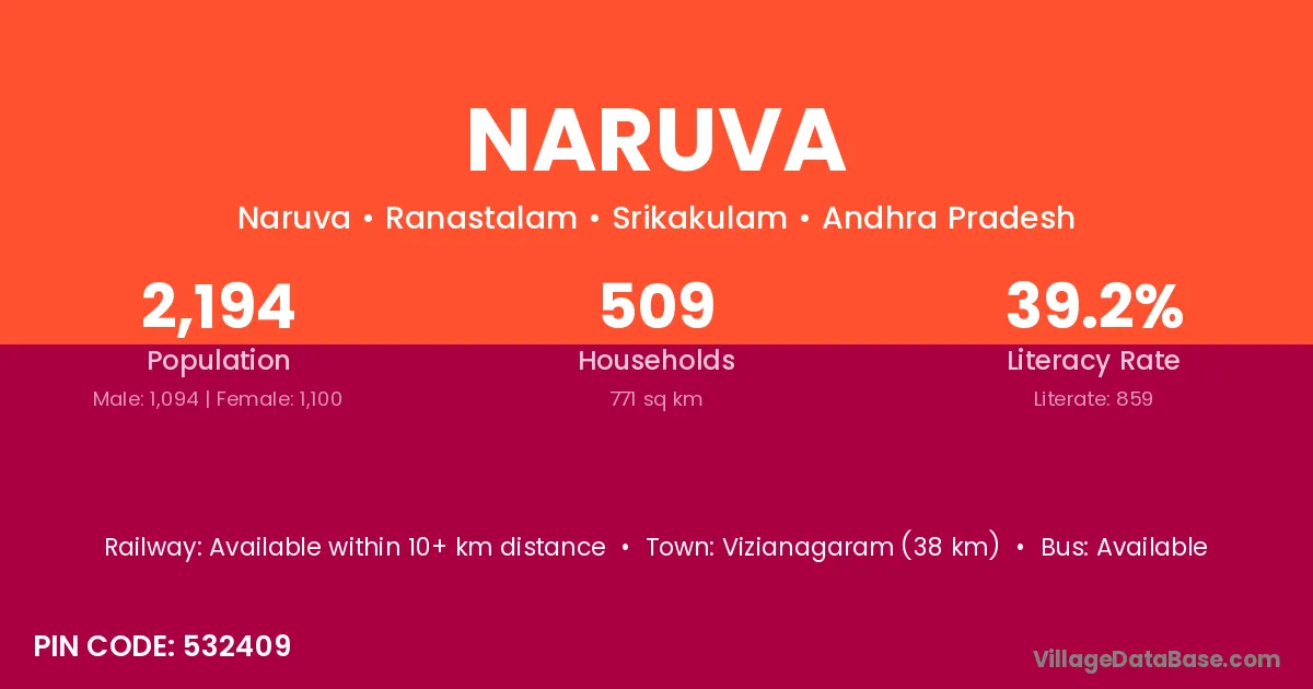 Vizianagaram (38 km) is the nearest town to Naruva village for major economic activities and is located approximately 38 km away.