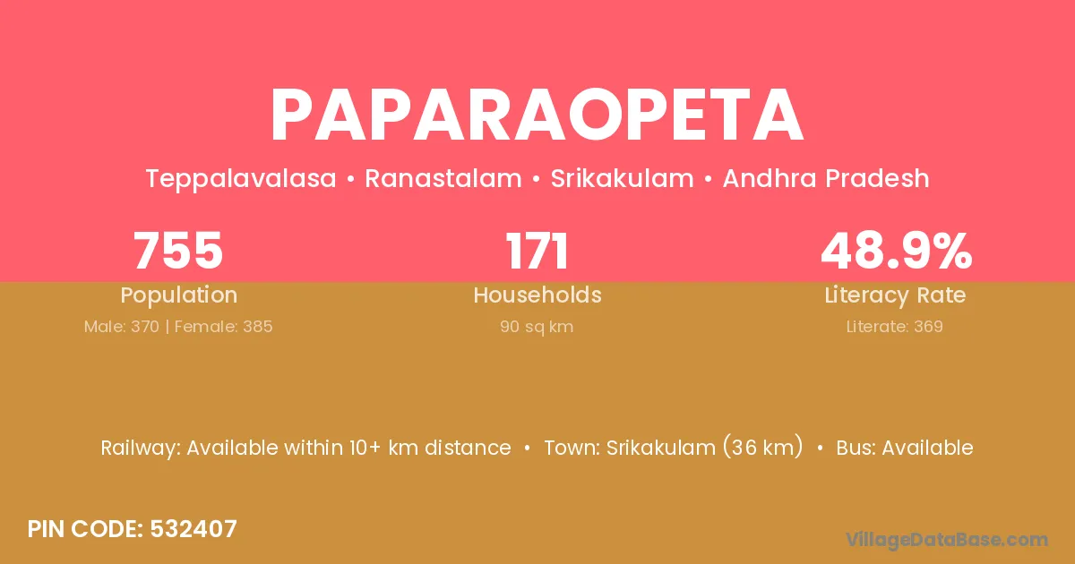 Paparaopeta village has a total population of 755 people, of which 370 are males and 385 are females.