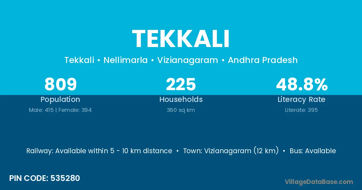 Vizianagaram (39 km) is the nearest town to Tekkali village for major economic activities and is located approximately 39 km away.