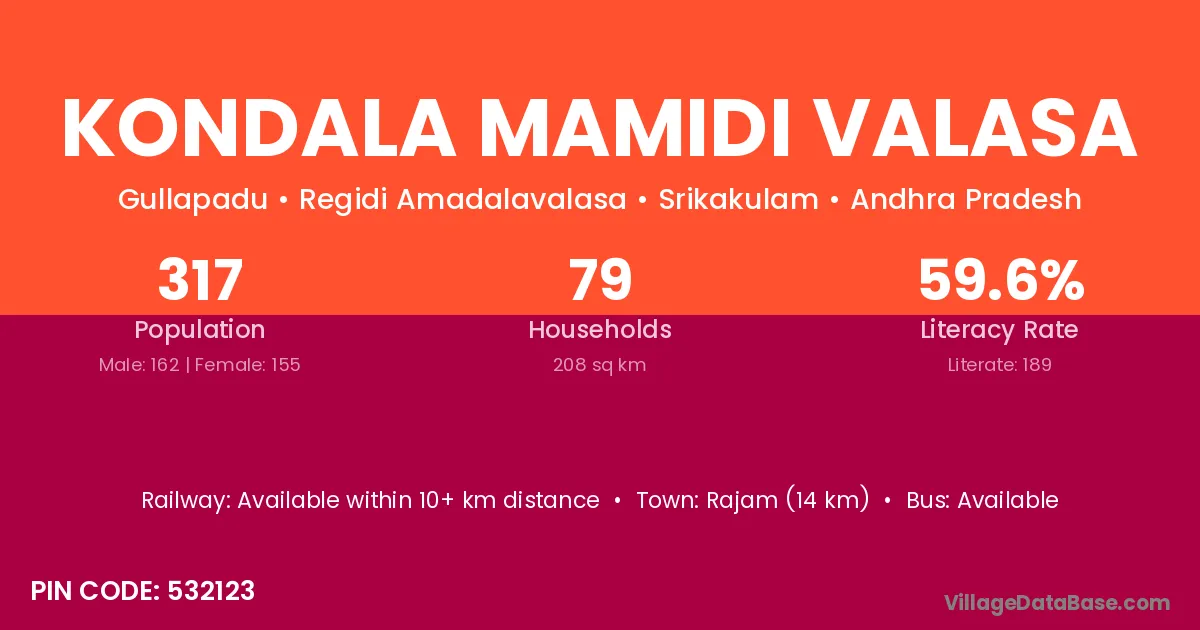 Kondala Mamidi Valasa village has a total population of 317 people, of which 162 are males and 155 are females.