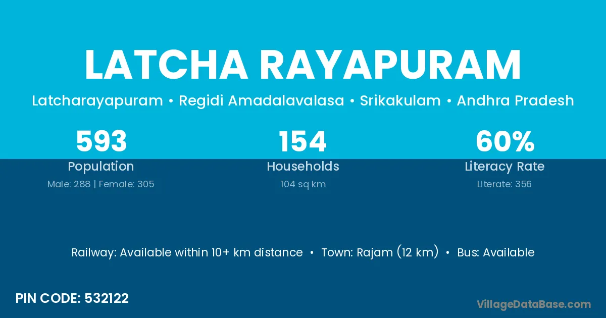 Rajam (12 km) is the nearest town to Latcha Rayapuram village for major economic activities and is located approximately 12 km away.