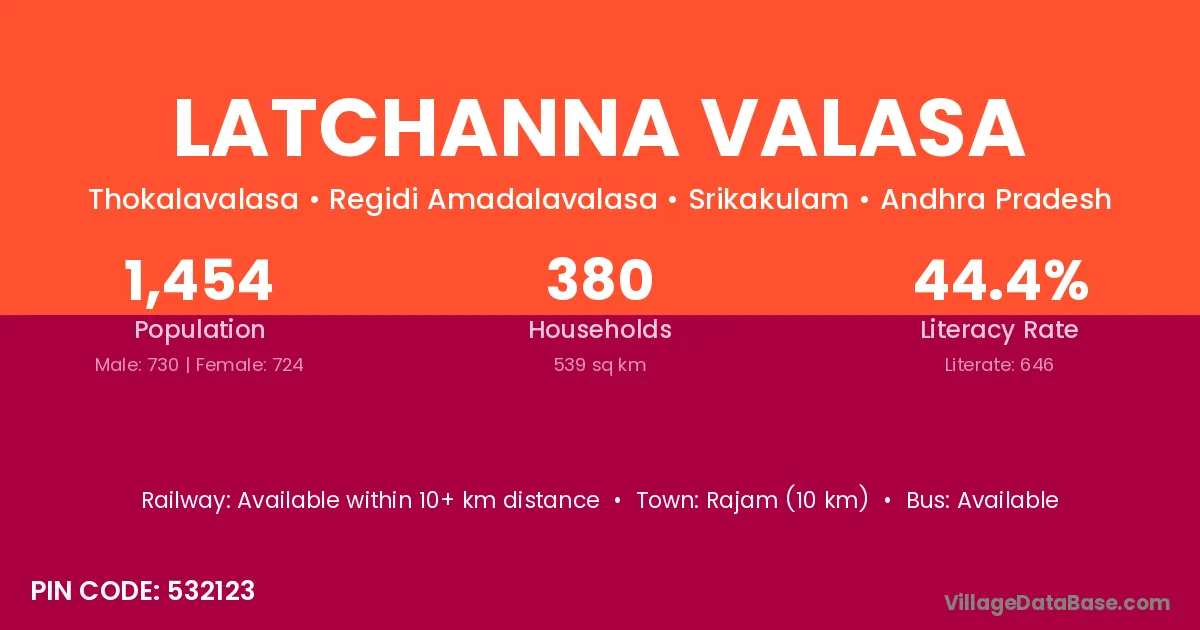 Latchanna Valasa village has a total population of 1,454 people, of which 730 are males and 724 are females.