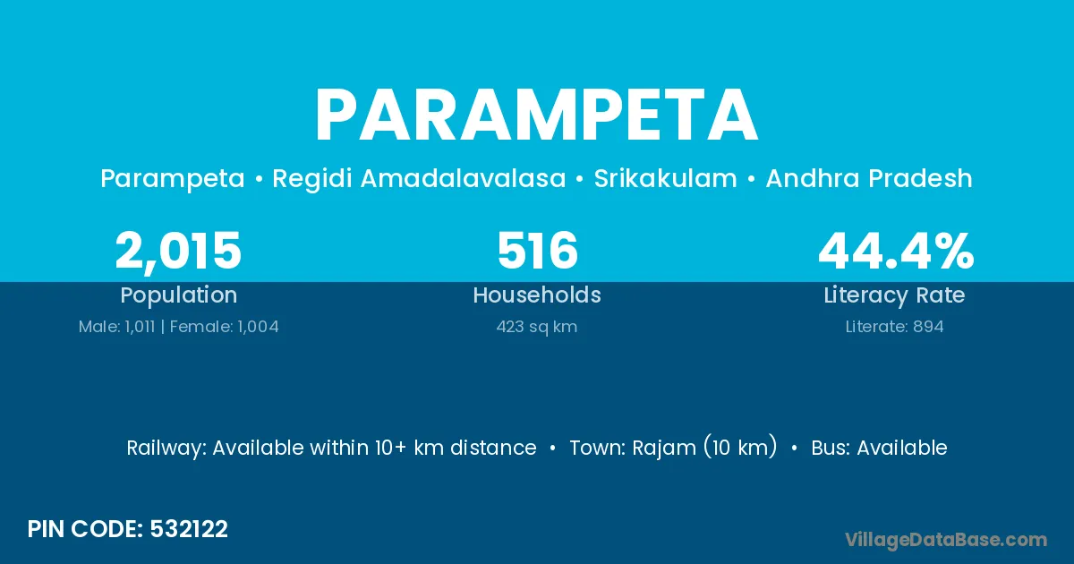 Rajam (10 km) is the nearest town to Parampeta village for major economic activities and is located approximately 10 km away.