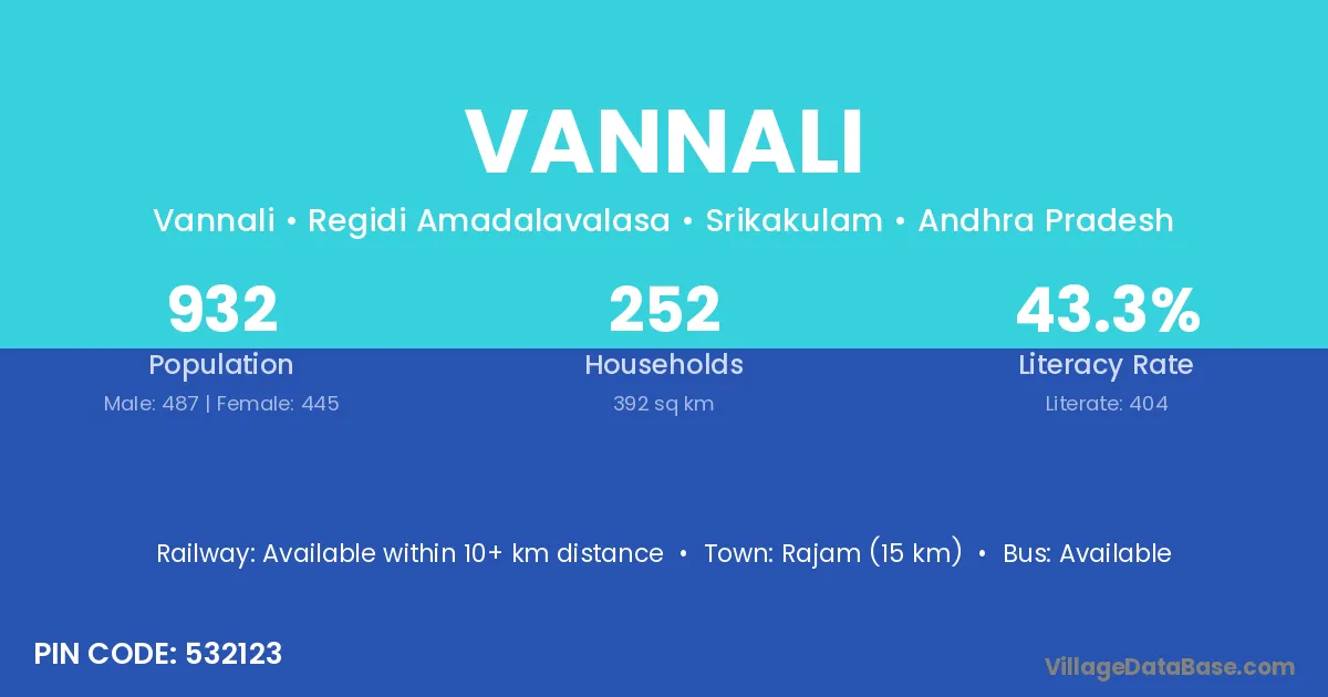 Rajam (15 km) is the nearest town to Vannali village for major economic activities and is located approximately 15 km away.