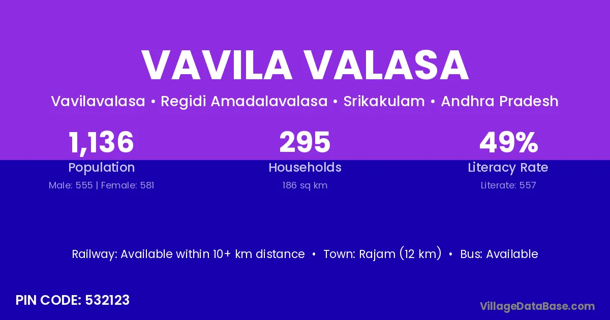 Vavila Valasa village has a total population of 1,136 people, of which 555 are males and 581 are females.