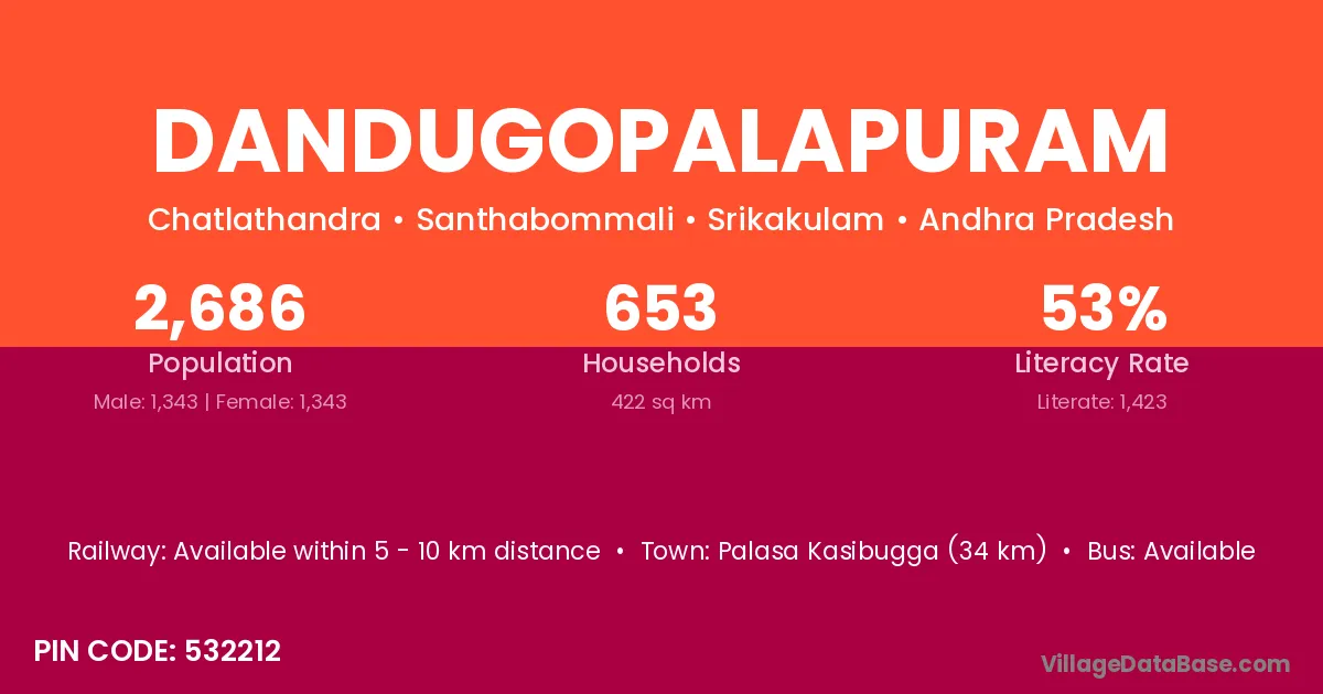 Palasa Kasibugga (34 km) is the nearest town to Dandugopalapuram village for major economic activities and is located approximately 34 km away.