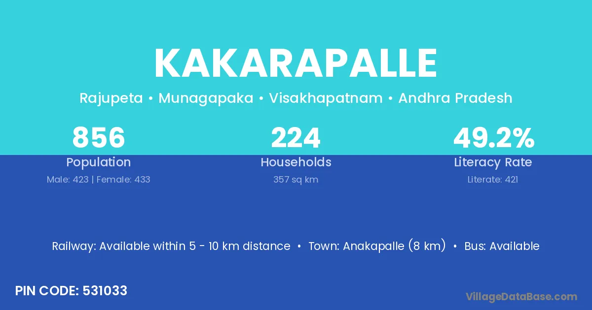 Palasa Kasibugga (45 km) is the nearest town to Kakarapalle village for major economic activities and is located approximately 45 km away.