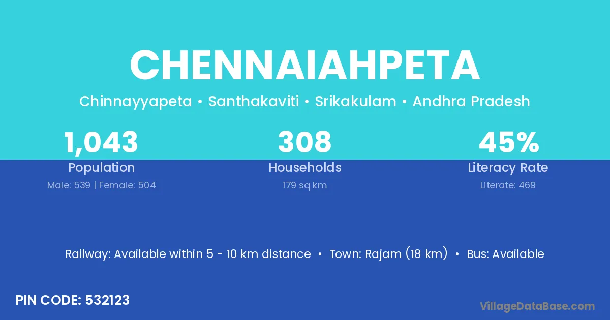 Rajam (18 km) is the nearest town to Chennaiahpeta village for major economic activities and is located approximately 18 km away.