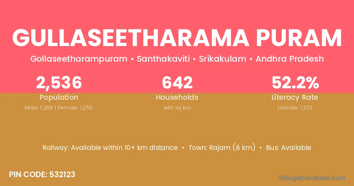 Gullaseetharama Puram village has a total population of 2,536 people, of which 1,286 are males and 1,250 are females.