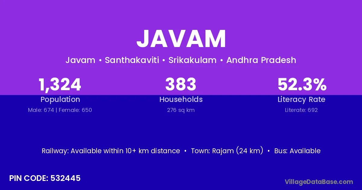 Rajam (24 km) is the nearest town to Javam village for major economic activities and is located approximately 24 km away.